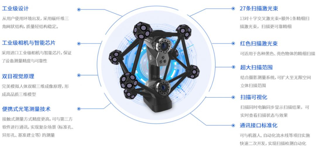 【適用領(lǐng)域】:質(zhì)量檢測與控制、逆向設(shè)計、數(shù)字展示、汽車制造、模具制造、航空航天、重工機械、醫(yī)療健康、3D打印、教 育科研、VR·AR等;