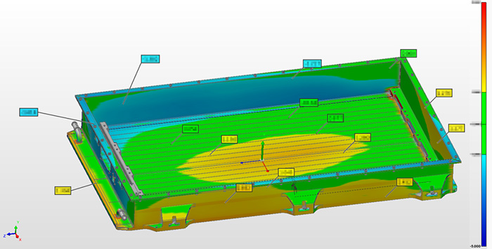 電池底板孔位及外型尺寸,掃描耗時(shí)5分鐘,完成數(shù)據(jù)檢測(cè)及報(bào)告,耗時(shí)10分鐘,并且掃描作業(yè)及檢測(cè)過程可實(shí)現(xiàn)自動(dòng)化,一鍵可完成自動(dòng)化出檢測(cè)報(bào)告。